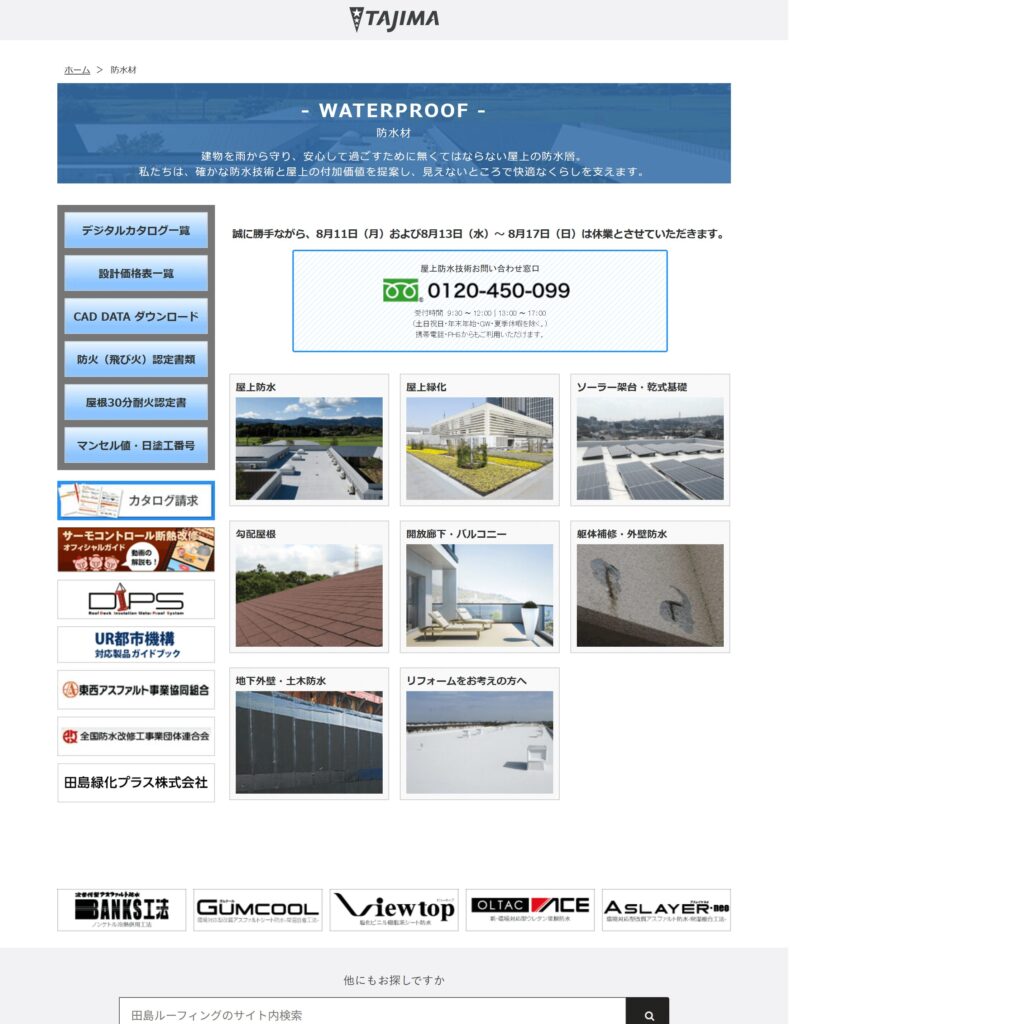 会社名 | 保土谷建材株式会社 | シーカ・ジャパン株式会社 | AGCポリマー建材株式会社 | 田島ルーフィング株式会社 | 日本特殊塗料株式会社 |