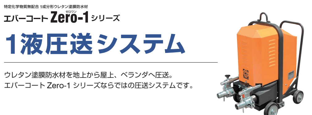 1成分形ならではの特長として、圧送施工も可能が可能であることが挙げられます。圧送施工とは、ポンプなどを用いて材料をホースで圧送して塗布する方法であり、高層階の屋上など、材料の運搬が困難な場所でも効率的に作業を進めることができるようになります。とくに、大規模な現場や階段を使って重い材料を運ぶのが大変な現場では、この圧送施工が大きなメリットとなるでしょう。また、エバーコートZero-1シリーズは、手塗りだけでなくこの圧送施工にも対応しており、現場の状況に応じて最適な施工方法を選択できる柔軟性があることも魅力です。