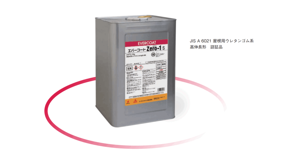 「エバーコートZero-1H」は、高強度タイプのウレタン塗膜防水材です。JIS A 6021のウレタンゴム系高伸長形の性能を満たし、さらにウレタンゴム系高強度形の規格である抗張積700N/m以上を満たす、高い塗膜性能を持っています。また、「立上り部補強布不要型ウレタンゴム系塗膜防水工法」として建設技術審査証明(BL審査証明-028)を取得し、立上り部の省力化が推進されています。「エバーコートZero-1S」